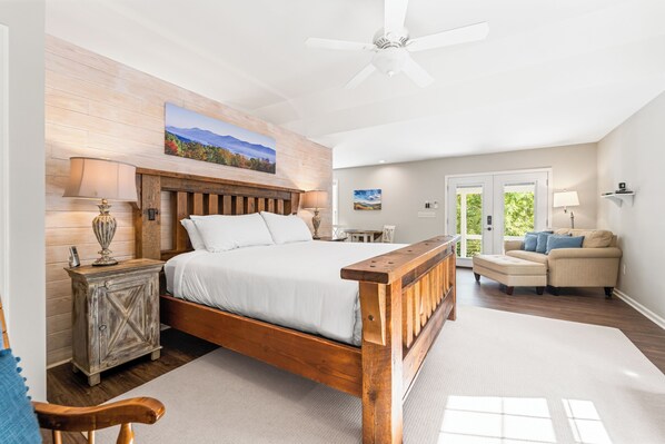 The Blue Ridge Cottage is a second floor room steps from the Main Inn. It has its own private deck and entrance which offer wooded and valley views. This cottage has a private 4 person Sundance Spa tub, and an outdoor propane fire pit. It features a