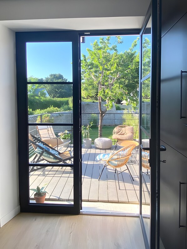 Terrasse ou patio, cuisine et réfrigérateur