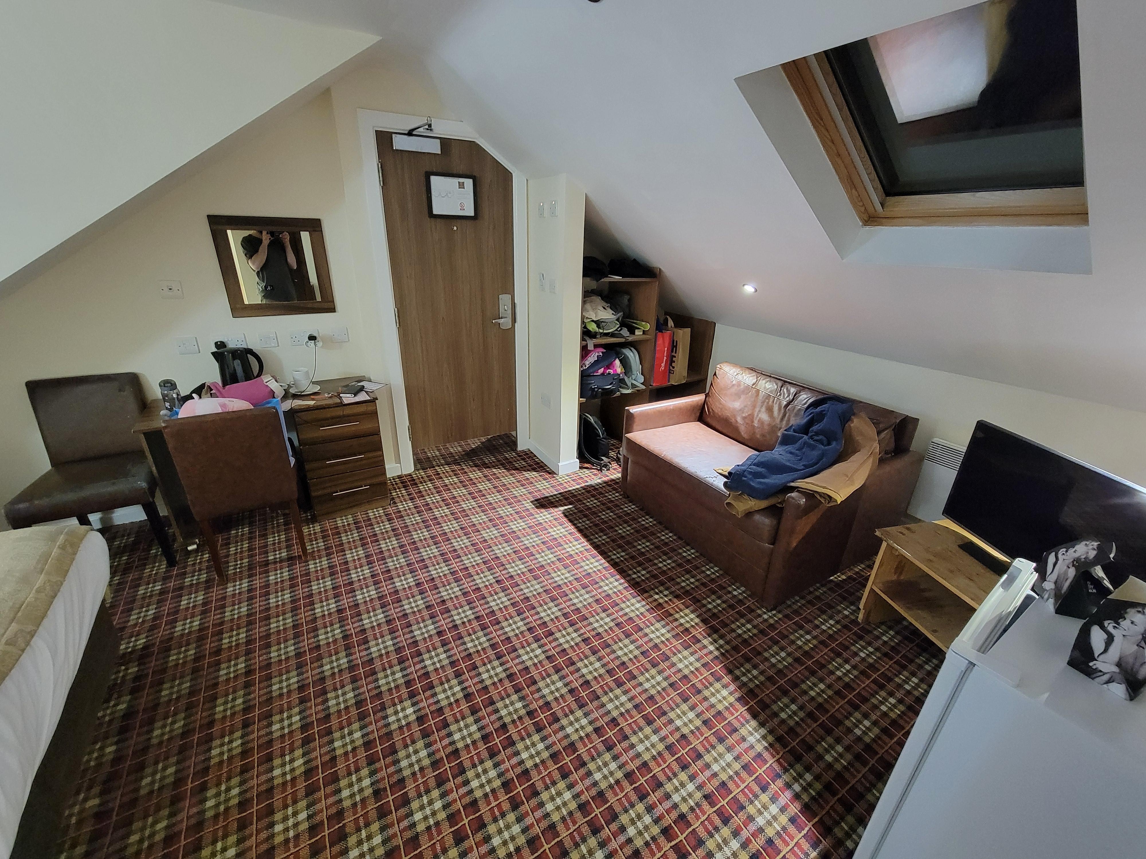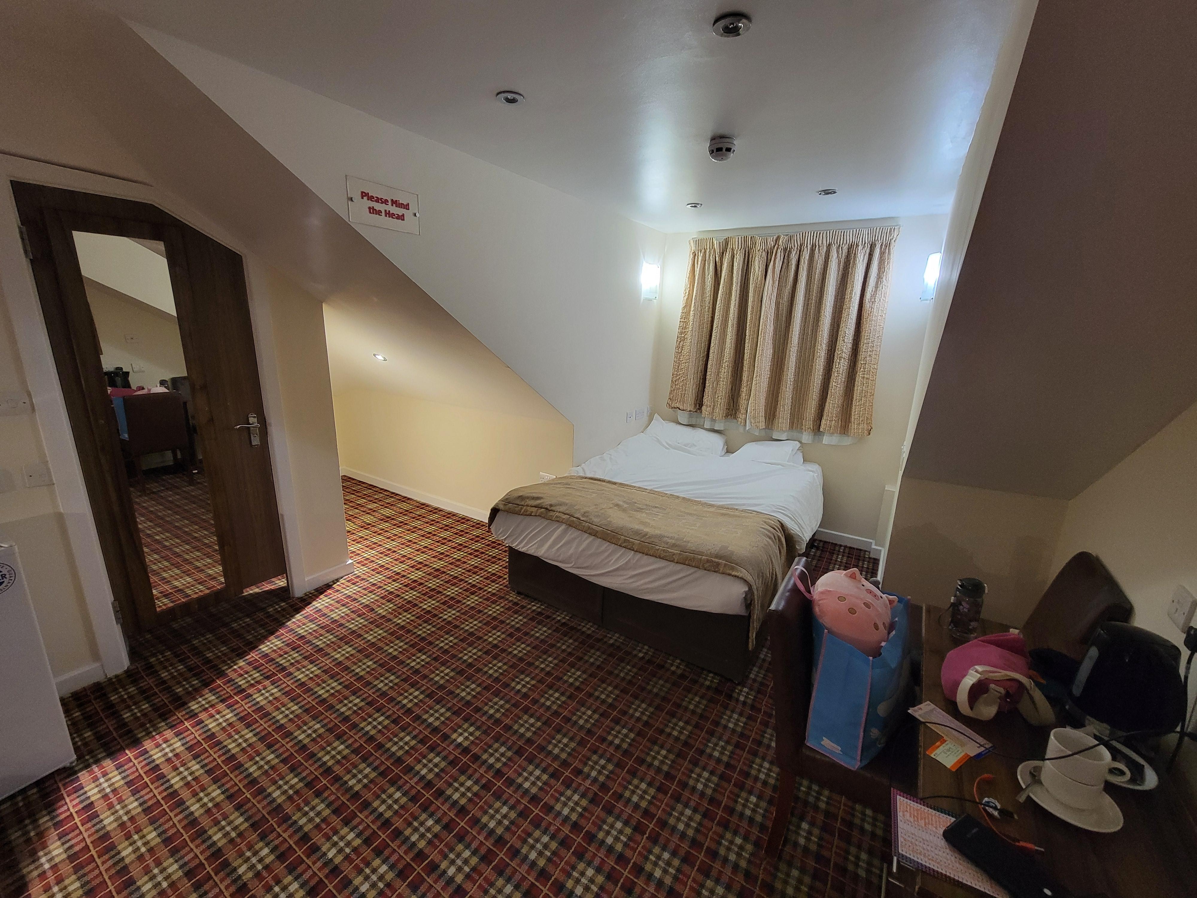 La chambre d'hôtel dans les combles était sommaire. Elle était identique aux photos de l'annonce. Cependant, il y avait beaucoup de points négatifs dans cette chambre. La literie n'était pas confortable (matelas à ressorts qu'on sentait donc mal de dos assuré, matelas tout taché ! Il est indispensable que la direction mette une housse de protection sur leurs matelas !). La porte de la cabine de douche est bloquée et ne se ferme pas entièrement. Attention à la double fenêtre au dessus du lit qui peut se déboiter et qui peut être difficile à remettre. J'ai allumé la tv par curiosité mais je n'ai jamais pu l'éteindre avec la télécommande sauf en la débranchant. 🤔