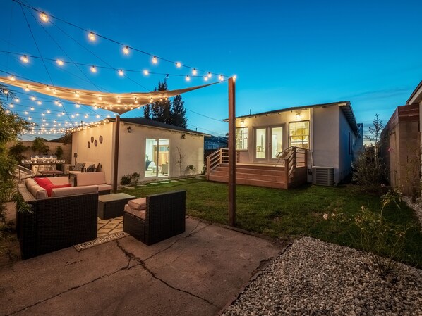 - Il y a quatre zones de séance à l'extérieur de la maison. Salon et espace barbecue avec des éclairages de ficelles qui seront incroyables la nuit, une table à manger devant la maison d'hôtes et un grand bureau en bois romantique juste à l'extérieur de la chambre lit king-size.