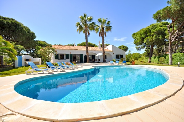 Basic but spacious villa which has all you need for a holiday. Much bigger than the photos portray. The beds were comfortable with good air conditioning. The kitchen was well equipped and the showers all powerful. It was great to have 3 bathrooms for the 4 bedrooms especially on holiday with adult children and partners The pool and grounds made the holiday - the pool is of a good size and slopes gently with steps into the shallow end. The gardens wrap around the villa which gives a great degree of privacy from the neighbouring villas and gives everyone the chance to escape the family if needed. There is also a roof terrace but it was too hot to use it. The location on the Vila Sol complex is perfect being tucked away in a little close but only a few minutes walk from the small shop and restaurants. Would highly recommend the Wine Bistro restaurant on the complex for dinner and the café for a nice breakfast or light lunch. Oscars is great if you want a sports bar atmosphere and there is a great fish restaurant over the road from the complex. Lidl, Continente and Pingo Doce supermarkets all within a miles taxi ride away and the resorts of Vilamoura and Quarteira only 10 mins by car/taxi. The only downsides are that the villa could do with some updating as it is a little tired but it was clean and tidy. The other negative is there is a lack of shade in the garden and a couple of parasols would provide that. There was a parasol in the utility cupboard but no base for it!! The trees do provide shade in the garden at various times of the day but not on the terrace where the table and chairs are. Having said that we would definitely return again as value for money it was perfect for our needs