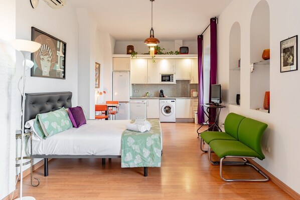 Ce charmant espace a été conçu de manière réfléchie avec un agencement ouvert qui intègre harmonieusement les espaces de vie, de sommeil et de cuisine. L'espace de vie dispose d'un coin salon confortable avec un canapé, idéal pour se détendre en regardant la télévision après une journée passée à explorer la ville. À proximité, un lit double en peluche garantit une nuit de sommeil réparatrice dans un coin tranquille de la pièce.