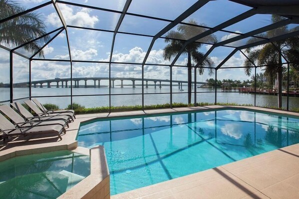 Belle maison de deux étages de cinq chambres avec une vue imprenable sur la rivière Marco. Faites un plongeon rafraîchissant dans la piscine chauffée surdimensionnée ou le spa dans la grande véranda blindée. La grande salle dispose d'un canapé en cuir et d'un siège d'amour ainsi que de 3 fauteuils et d'une grande télévision à écran. La salle à manger est meublée d'une table de style Tommy Bahama avec huit chaises. Le bar du petit déjeuner a six tabourets et le coin petit déjeuner a une table qui peut accueillir confortablement six personnes. Il dispose également d'une grande fenêtre panoramique pour que vous puissiez profiter du jeu des dauphins et nager avec les lamantins. Cette maison dispose également d'un ascenseur à bateaux de 12 000 lb et d'un quai pour votre usage. La renonciation à l'ascenseur à bateaux doit être signée.