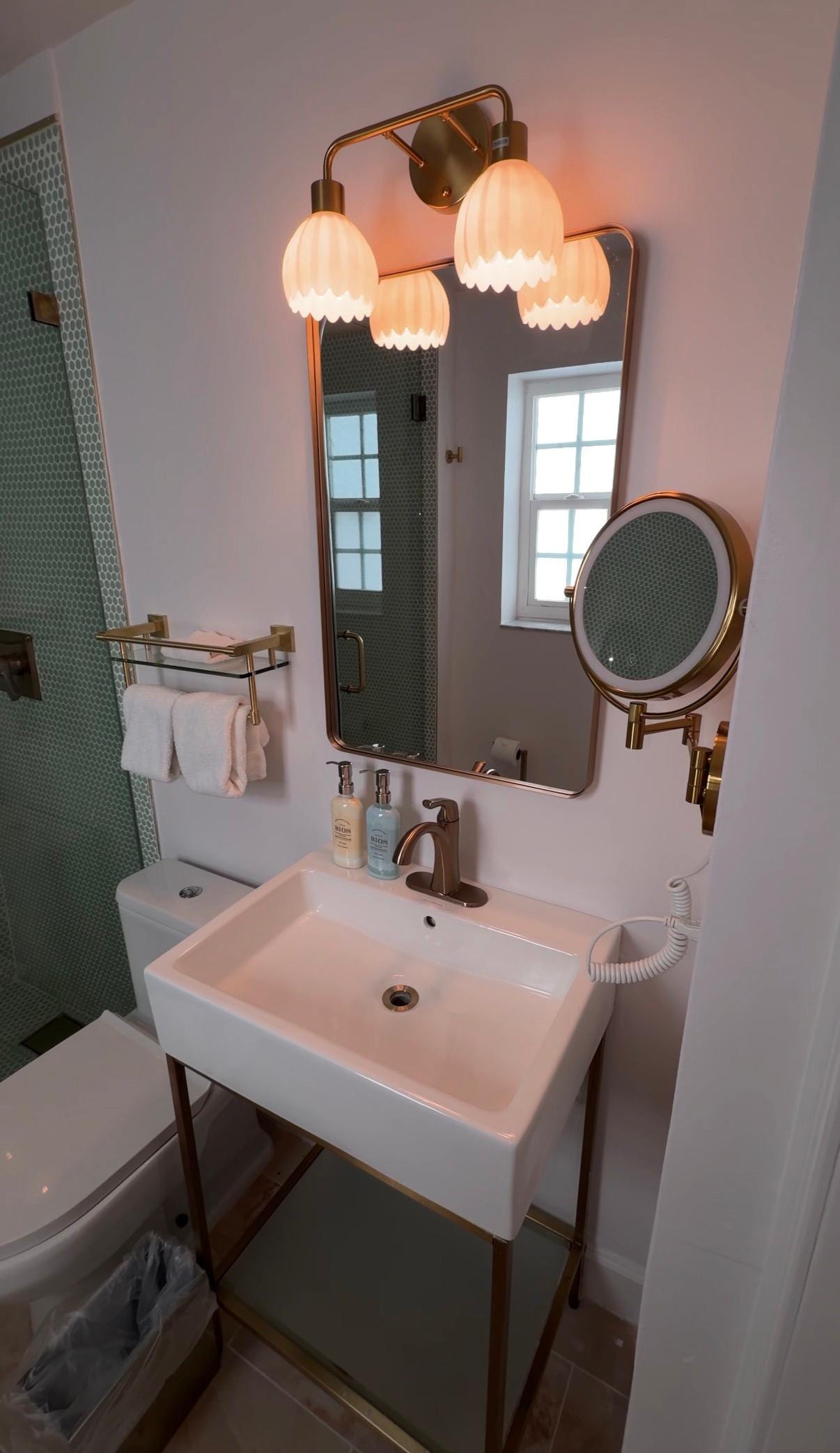Salle de bains avec douche à « effet pluie » et articles de toilette gratuits