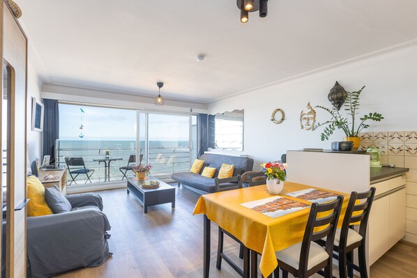 Appartement moderne au 6ème étage, idéal pour couples ou petites familles, avec 1 chambre avec lit double. Le séjour confortable dispose d’un canapé-lit pour 2 personnes et de baies vitrées du sol au plafond donnant sur la belle terrasse avec vue splendide sur la mer – parfait pour profiter du soleil et de la mer. La cuisine ouverte entièrement équipée offre tout le nécessaire, et la salle de bain rénovée comprend une douche à l’italienne et des toilettes, pour un séjour confortable et agréable. Wifi: oui - parking: non inclus - draps: à apporter - serviettes: à apporter.