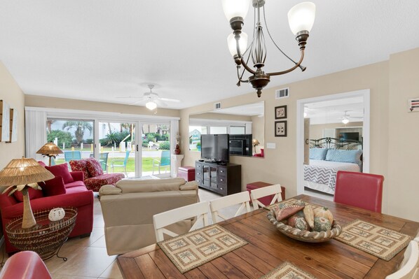 Cette vue sur le golfe, 2 chambres, 2 salles de bain condo est bien entretenu et récemment mis à jour. Unité au rez-de-chaussée très pratique avec un grand patio donnant sur une pelouse, idéale pour les familles avec enfants, les personnes âgées ou ceux qui ne se soucient pas de monter les marches ou d’attendre l’ascenseur. Il y a un très grand lit dans la chambre principale, un grand lit dans la deuxième chambre et un canapé-lit. Laveuse / sécheuse dans l'unité. Porte de la plage privée est à quelques pas de votre porte patio.