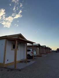 We stayed at the Sandstone Cabin for one night to see Arches National Park. As someone who doesn’t usually go for camping or cabin stays, I really enjoyed this place! It had the perfect amount of space we needed for my husband and me plus our two dogs. Everything inside the cabin was extremely clean, and the AC worked very well. The cabin was comfortable and had a spacious table with three barstools, a kitchenette (mini-fridge, microwave, coffee maker), smart TV, and strong WiFi. It also came with complimentary shampoo, conditioner, body soap, and hand soap, along with plenty of white, brand-new towels.The private toilet and sink in the cabin was wonderful, and the showers were located very close by in an updated and clean building. We had our own parking spot right beside our cabin. There was even a fenced dog area located nearby that had poop bags and a trash can.Our row of cabins was located closest to the road, but the sound of cars didn't wake us up or bother us at all. We woke up the next morning after hearing our alarm. Another bonus was that the cabins surrounding us didn’t seem to be occupied, so it felt like we had the whole row to ourselves.The location was perfect, and the receptionist at the front office was available from 8 AM to 8 PM. She provided us with a map of the site and was very helpful. Every staff member we encountered was friendly and welcoming. The price was also hard to beat for everything included.We would love to stay there again!
