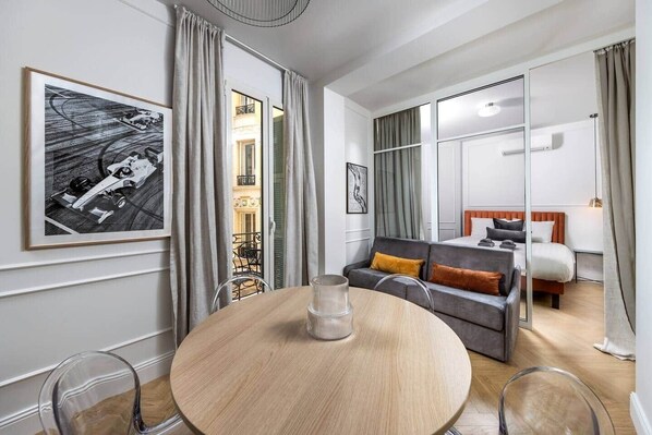 Ce studio soigneusement aménagé dispose d’un lit queen size confortable, d’un coin salon agréable et d’un espace de travail dédié, idéal pour le télétravail ou pour préparer vos excursions. De grandes fenêtres laissent entrer une belle lumière naturelle et créent une atmosphère chaleureuse.