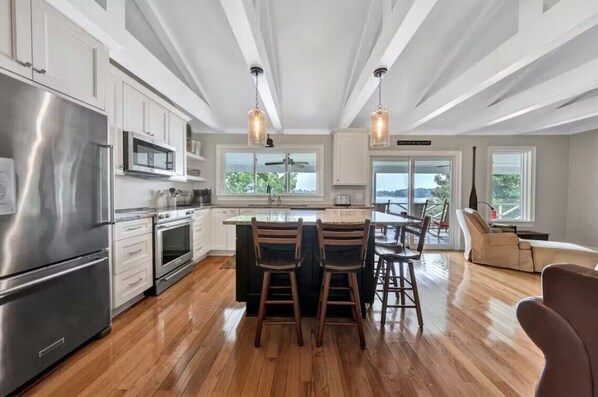 We've been coming to the lake for the past 30 summers. Over the years, our family has grown, our children have married and have had own children. Now we are a group of 16 with 7 children under 9. This year we rented the Hickory Cottage and Hastings on Hickory right next door. What a great week. Both houses met our needs beautifully. We had a quiet house and a loud house. A solitary house and a group house. The flexibility to move back and forth as the needs changed made the week so enjoyable. Hickory Cottage is a comfortable, well-appointed home house. Walking in is like putting on your favorite fall sweater. Gary and Kimberly could not have been more gracious. They take care of their home themselves and were there to great us as we arrived. Super helpful as Gary pointed out the best place and position to tie up our boat and to find the vast assortment of water toys (kayaks, floats, jackets, etc.) The dock is covered so we did all our swimming and water play here so babies wouldn't be exposed to the HOT sun. Loved the stairs going into and out of the water. The view of the Lake is really special. We could see into the cove as well as the main channel. So beautiful in the morning and evening as the boat traffic quieted down. Getting on the lake in one of the kayaks in the early morning was magical. I would 100% recommend this house and would happily return.