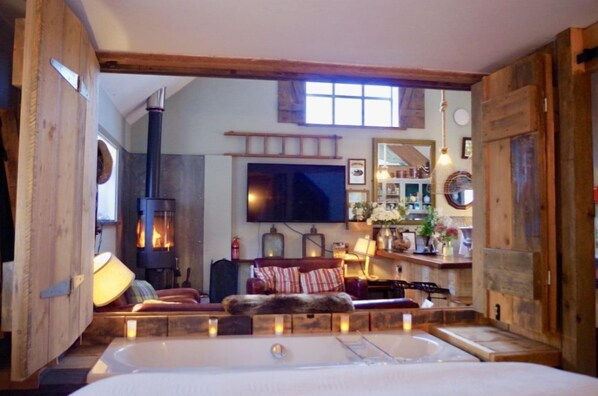 Le Cowshed est une belle, luxueuse, rustique, ingénieusement recyclée, rétro, super confortable barnlette à deux lits doubles avec un espace extérieur en verre attaché et couvert (la cabine) contenant une zone de détente, un coin repas et un bain à double extrémité afin que vous puissiez vous détendre sous les bulles et regardez les étoiles! À l'intérieur, une autre baignoire à double extrémité, un poêle à bois, une cuisine entièrement équipée, un salon, une chambre kingsize au rez-de-chaussée, une salle d'eau et une chambre kingsize mezzanine donnant sur la cuisine / salle à manger / salon en plan ouvert ci-dessous. Tous équipés d'une télévision à écran plat surdimensionnée, d'un son surround, d'une bibliothèque de DVD et d'une table basse en forme de coffre des années 1940 rempli de toutes sortes de jeux de société nostalgiques. En bref, une retraite boutique 5 étoiles, primée et totalement unique située dans certains des plus beaux paysages verdoyants du Cheshire entre deux pubs gastronomiques ruraux exceptionnels, véritablement sportifs. Nous pouvons également organiser des friandises VIP telles que du champagne frais à l'arrivée, arriver au feu allumé