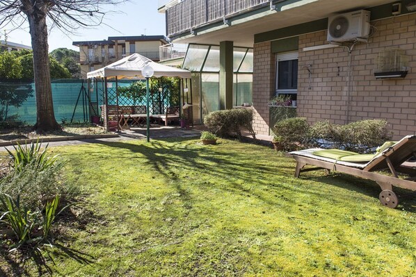Description: Fully equipped. Ground floor of building. Living room with dining table and sofa - separate kitchen with dishwasher - double bedroom - second bedroom with bunk beds - bathroom with shower and washing machine - garden on three sides equipped with table and chairs where you can eat. Air conditioning in every room. Double parking space inside the property.
