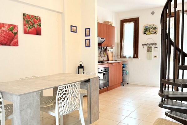 Ground floor: living room with dining table, sofa and kitchenette.