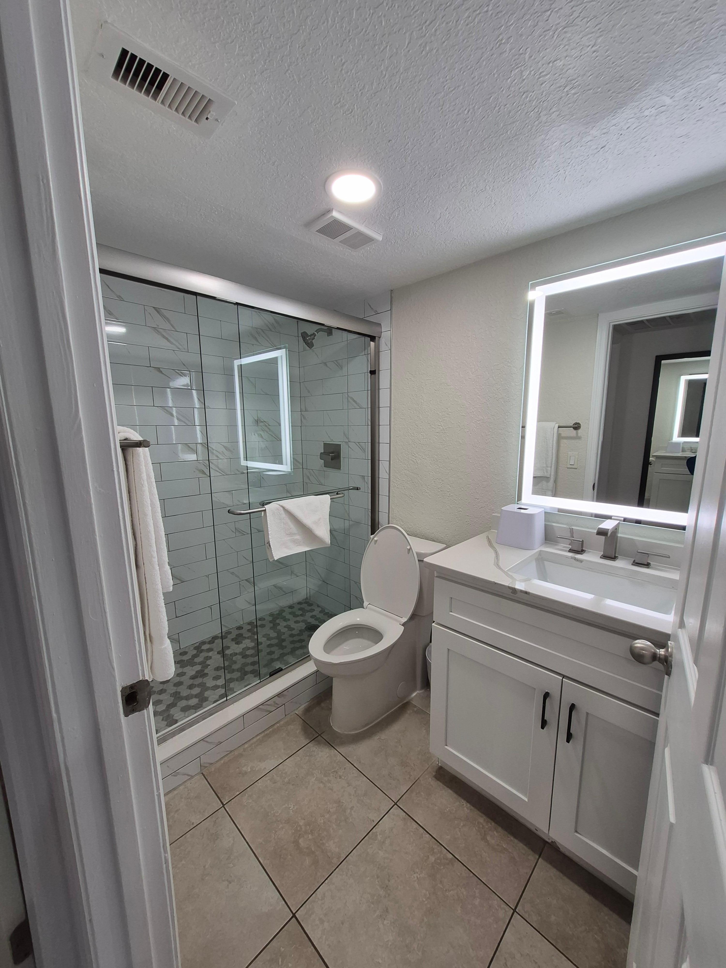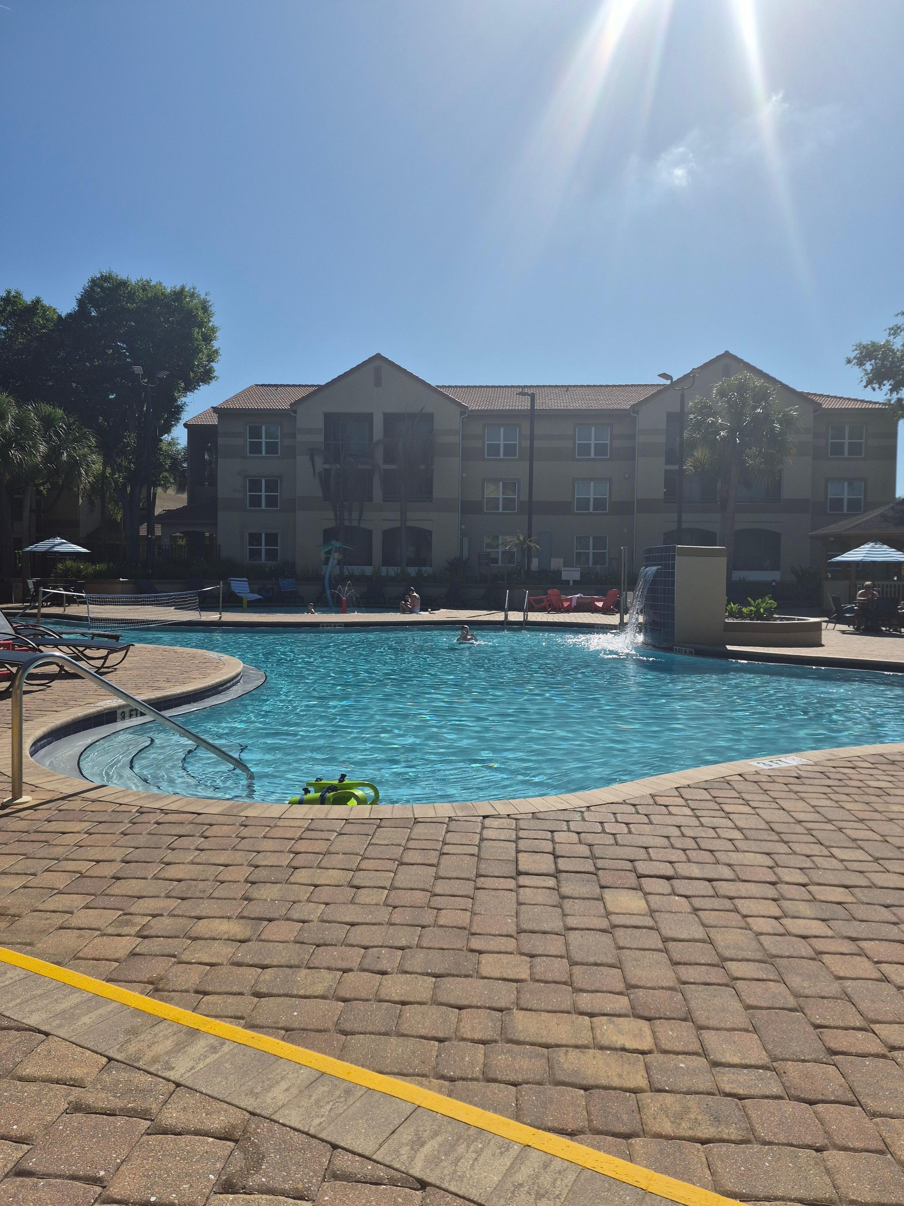 This was our first stay here and it was wonderful. We had a ground level 1 bedroom next to one of the 4 pools. Our room came with a pull out couch, queen or king bed, washer + dryer and kitchen and patio. Everything we could ever need. Lots of towels which we washed when needed. We used the heated pools most. The hotel is close to alot of stores ect. We would deff stay again it was very clean, updated and lots of pools for the kids.