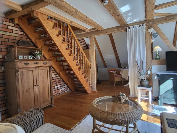 die Ferienwohnung im Obergeschoss erstreckt über 2 Etagen. Schlafen unterm Sternenhimmel im Dachgeschoss, mit Doppelbett 2,00 x 1,80 m (getrennte Matratzen). Liebevoll und fachgerecht 2017 grundsaniert, alles wurde mit natürlichen Baustoffen hergerichtet. Freigelegtes altes Sichtfachwerk und Naturholzböden zeigen die Persönlichkeit der Wohnung. Naturholzmöbel sorgen für ein wohnliches Ambiente. Der offene Wohnstil mit komplett ausgestatteter Küchenzeile, ein lichtdurchflutetes Bad und der großzügige Wohnraum sorgen für Gemütlichkeit. Im großen naturbelassenen Garten lädt eine sonnige Gemeinschaftsterrasse am alten Apfelbaum zum verweilen ein.Ein Parkplatz befindet sich auf dem Grundstück. Die Wohnung ist nicht geeignet für Kinder unter 6 Jahren. Die Ferienwohnung wir mit Bettwäsche und Handtücher übergeben.