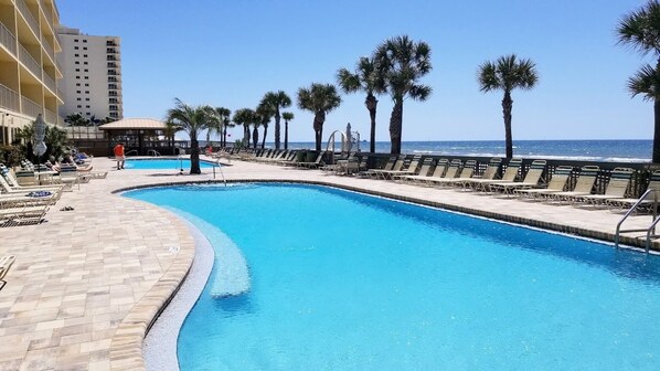Évitez la rue Front Beach très fréquentée et restez dans la zone de Thomas Drive avec accès à 3 routes différentes pour sortir et se déplacer. Marchez sur la plage jusqu'à Spinnaker's, Pineapple Willies. Le parc aquatique Emerald Falls, les bateaux tamponneurs, les voiturettes et le golf miniature sont tous accessibles à pied. Vous êtes à quelques minutes des terrains de golf de championnat. De plus, vous n'êtes qu'à 5 minutes du Captain Anderson's, J. Michael's, le Grand Marlin qui sont tous des repères pour manger.