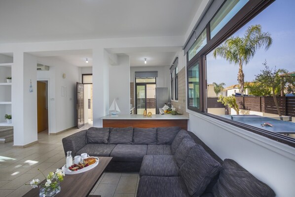 Vous pouvez très facilement marcher même avec une poussette au centre où vous pouvez trouver une pléthore de restaurants, supermarchés, terrains de jeux, bars. L'emplacement de la villa est parfait pour les personnes avec enfants, couples, familles et en général pour tout le monde. La plage de Sunrise est également à 5-6 minutes à pied maximum.