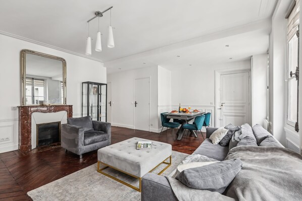 Cet appartement de 90 m² est situé au 4e étage avec ascenseur, offrant un espace polyvalent pour vivre, dîner ou travailler. Il est meublé avec un canapé, une TV écran plat et une table à manger. La cuisine est entièrement équipée, avec une machine à café Nespresso et une machine à laver.