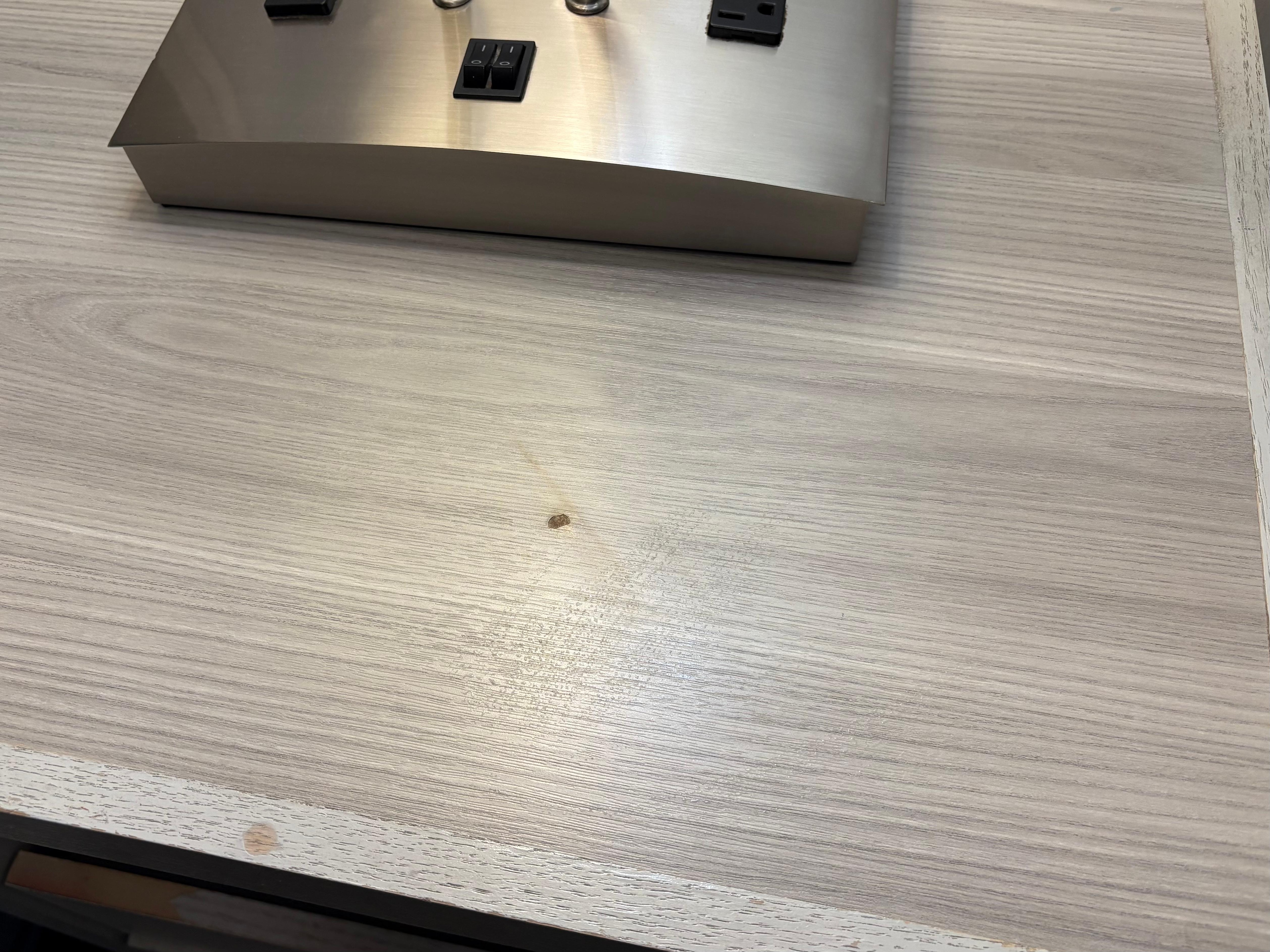 The room had 2 light bulbs out, and bedsheet had a stain on it, nightstand has scratches, and bathroom hook metal is broken along with detached shampoo body wash dispenser.
