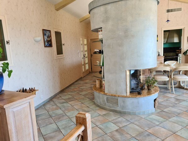 Les espaces intérieurs se compose d’un grand séjour avec canapé et fauteuils en cuir, la salle à mangée avec une table qui peut recevoir 8 convives est juste à coté. Un petit bureau complète cet espace. Dans le prolongement de cet espace se trouve la cuisine entièrement équipée avec quelques plus comme une machine à thé Nespresso, une cave à vin réfrigérée et un frigo américain XXL qui produit même de l’eau gazeuse filtrée.