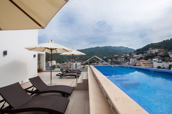 Le toit dispose d'une piscine à débordement, d'un barbecue en plein air et d'un coin repas avec une vue imprenable sur la ville, la baie et les montagnes.