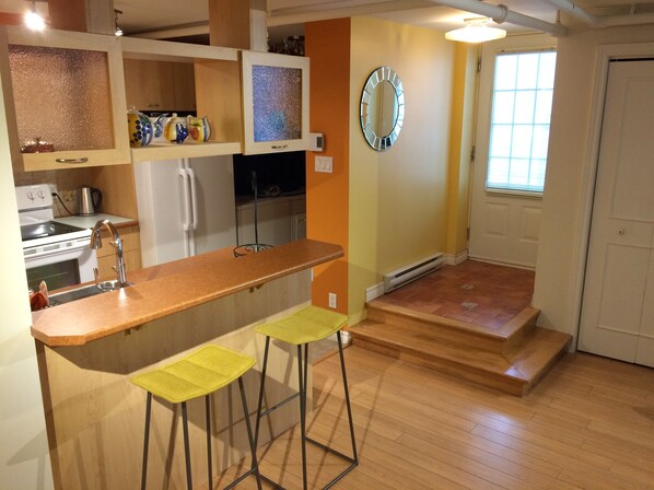 L'appartement de 700 pieds carrés est entièrement équipé avec réfrigérateur, four, micro-ondes, lave-vaisselle, laveuse-sécheuse, machine à café ainsi que la vaisselle.