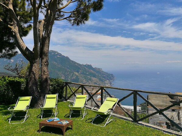 Der wahre Zauber des Hauses ist der 450m² Wohnung Garten mit einem nicht enden wollenden Panorama von Ravello, auf der Küste und die umliegenden paar kleinen, alten Städte und Dörfer, die entlang der grünen Arena von Monti Lattari und dem engen Tal des Drachen verstreut (ein Tal, das von Ravello Scala trennt), die gepflegten Gärten haben und terrassierten Feldern und enden am Meer.