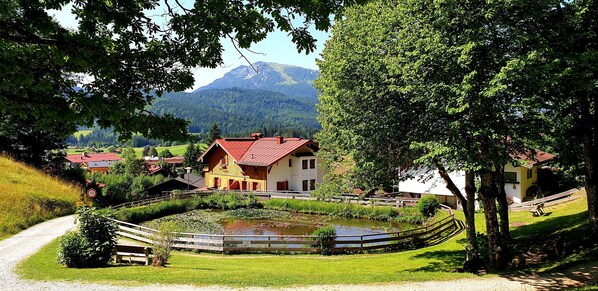 Unser familiär geführtes Haus Seerose, am herrlich gelegenen Seerosenteich im Luftkurort Reit im Winkl, befindet sich am Fuße der Südhanglage des Hausberges, sehr ruhig aber doch zentral, nur 3 Gehminuten vom Zentrum entfernt. Letztes Haus im Seerosenweg (Sackgasse) Unser Haus liegt südwestlich mit herrlichem Panoramablick aufs Kaisergebirge Die im rustikalen Stil eingerichteten Nichtraucher-Ferienwohnungen verfügen über separate, komplett eingerichtete Küchen, Bäder mit Duschen, WC, Kabel-TV, und Radiowecker. Unseren Gästen steht auch Internet zur Verfügung. Gerne bieten wir auch Brötchenservice an. Am Haus befinden sich Garagen und Parkplätze. Ein kleiner gemütlicher Garten sowie eine große Sonnenterrasse laden zum Entspannen ein. Direkt vom Haus Seerose aus beginnen wunderschöne, anspruchsvolle, aber auch gemütliche Wanderwege entlang des Wasserfalls. Sie sind für sportliche als auch für ältere Gäste geeignet. Gleich hinter unserem Haus befindet sich der Barfuß-Pfad und ein neuer, TÜV-geprüfter Klettersteig am Wasserfall. Die daneben befindliche Kneippanlage bringt den Kreislauf und die Gesundheit wieder in Schwung. Freies Parken auf allen gemeindlichen Parkplätzen von Reit im Winkl. Im Winter befinden sich bestens gepflegte Loipen in unmittelbarer Nähe unseres Hauses (5 Gehminuten).