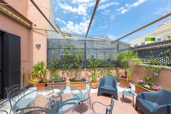 Wunderschönes Penthouse in der Via Lucullo, nicht weit von der Piazza Barberini, der Via Vittorio Veneto und der Piazza di Spagna entfernt. Das Anwesen befindet sich im fünften Stock eines wunderschönen Gebäudes mit einem Aufzug, der im vierten Stock hält, sodass die Wohnung über eine Treppe erreichbar ist. Die Wohnung besteht aus einem wunderschönen Wohnzimmer mit großer Helligkeit dank des Fensters mit Blick auf die Terrasse. Dieses Zimmer ist mit Sofas, darunter einem Schlafsofa, Tischen mit Stühlen und Fernseher, direktem Zugang nach draußen ausgestattet. Weiters gibt es eine Wohnküche und komplett ausgestattet, ein Badezimmer mit Dusche und ein Schlafzimmer mit Doppelbett. Die wunderschöne Terrasse ist einzigartig, ausgestattet mit Gartenmöbeln und vielen Töpfen mit Pflanzen und Blumen, die dieser Terrasse eine herrliche Farbe verleihen. Die Einrichtung im klassischen Stil mit einigen modernen Elementen verleiht dieser Wohnung einen Hauch von Klasse. Zu den Annehmlichkeiten gehören Klimaanlage in allen Zimmern, Waschmaschine, Smart-TV und WLAN. Die Gegend ist von strategischer Bedeutung, um die wichtigsten Sehenswürdigkeiten im historischen Zentrum Roms zu Fuß zu erkunden. Die U-Bahn-Station Barberini befindet sich nicht weit entfernt. Perfekte Wohnung für Paare oder kleine Familien, die einen kurz- oder mittelfristigen Aufenthalt in der Ewigen Stadt verbringen möchten.