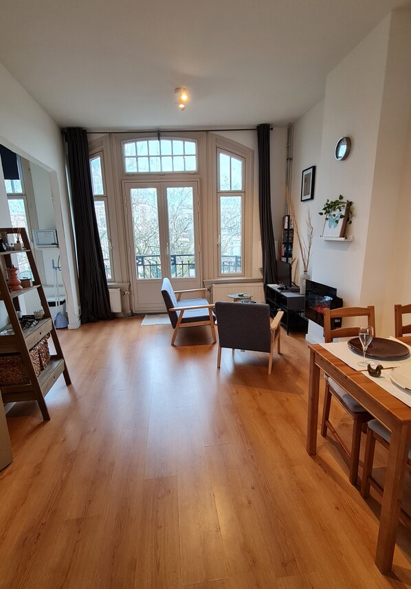 The apartment is quaint yet still quite modern. It has new fixtures but maintains its old world charm. In North America we would refer to it ad the third floor since there are two full sets of stairs to climb . My age and a physi al handicap did make that quite a chore. Add to the the steepness and narrowness of the spiral stairs and they do pose a challenge. Eddie, our host, was quite friendly and welcoming and there was only a slight lag in getting a response to our communication. The xondo is about 950 meters from Rotterdam Centraal train station. About a 10 minute walk for someone able bodied. There are plenty of shops and restaurants nearby and the tram is within 200 meters. Parking can be a challange but that is the case everywhere in Holland. Best to use public transport if you can. As for the apartment itself, I believe it depends on your likes and dislikes. For me, the bed was comfortable, it has an adequate kitchen, cozy sitting room with TV, loveseat and chairs, a dining table and wifi. There is a washer just outside the apartment door which we found very handy. The bathroom is really more of a wet room. There is only a shower and like a good number of Dutch homes, a small curbless shower, toilet and a small wash basin. It is all clean and mildew free and we didnt want for anything. Iur stay was disturbed by the moving in of a large number of young men into the condo below. Otherwise it is a great and vibrant area in a brownstone that predate the first great war.