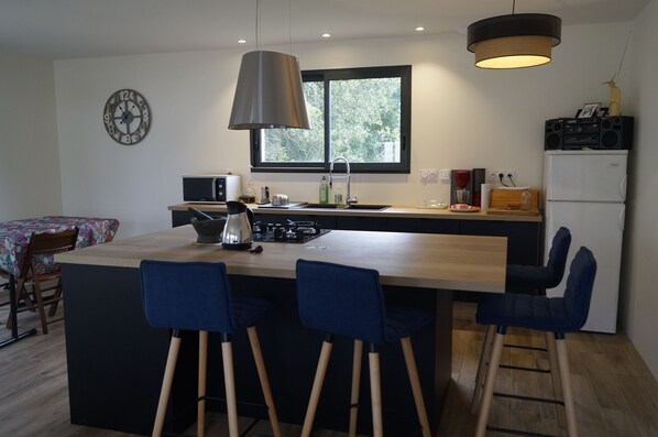 La cuisine comporte un grand îlot avec plaque à feux gaz et four ainsi que 4 places. Une grande table peut recevoir 10 personnes. Lave vaisselle,réfrigérateur,micro-ondes et accessoires de cuisines.