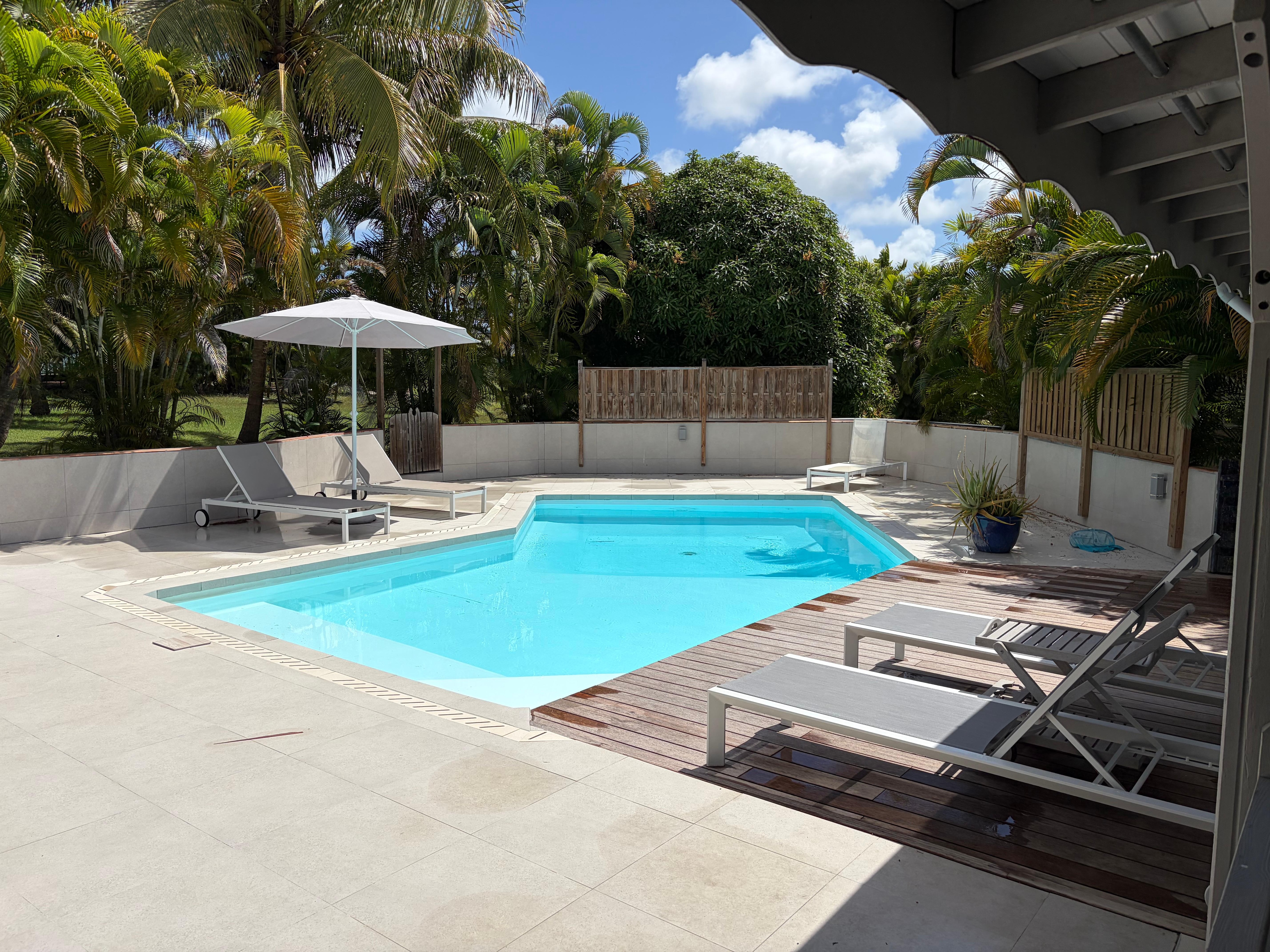 A proximité de St François et Le Moule. A quelques minutes du centre ville, du casino, des commerces, du port de pêche, de la gare maritime d'où partent les bateaux pour les excursions dans les îles voisines (Marie-Galante, Les Saintes, La Désirade, Petite-Terre). Surf, plongée, scooters de mer, Quad, sorties 4x4. A St François, vous trouverez également une marina, un aérodrome (parachutisme), un golf international (18 trous) et un haras. Nombreux restaurants. Marché nocturne le mardi et tous les matins (sauf le lundi). La Pointe des Châteaux, le lagon aux eaux turquoise, plages de sable blanc, et bien d'autres lieux magique. C’est la maison de vacances pour la famille, entre amis ou en amoureux. Le bleu de la piscine, le blanc?le vert de la végétation tropicale où s’intercalent les nombreux coloris des fleurs exotiques, l’espace, les nombreux accessoires de jardin, suggèrent d’emblée les rires, la bonne humeur.