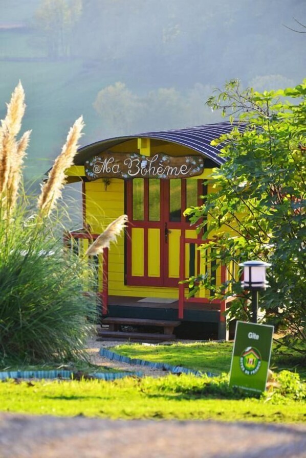 Roulotte début 20ème siècle chargée d'histoire soigneusement réhabilitée en petit gîte tout confort, à 9 km du lac d'Aiguebelelette et de la plage. Charmant hameau typique lové en pleine campagne en lisière de prairies et forêts. Superbe cadre naturel préservé. Très bon confort. Agréable et cosy. Vaste terrasse ombragée. Spacieux jardin aménagé et fleuri de 500m² en commun. Belle vue sur la campagne. Roulotte aménagée en petit gîte en totale indépendance (à 20m de la maison des propriétaires). Rez-de-chaussée surélevé (accès par 3 marches). Roulotte offrant un coin cuisine avec petite table, espace nuit ouvert (fermé par des rideaux) avec 1 lit 2 personnes 140x190 cm (+ 2 lits 1 personne "enfant" d'appoint en 70x180cm). Salle d'eau (douche et WC) fermée par un rideau. Draps inclus + lits faits + linge de maison inclus. Terrasse privative en gravier. Jardin privatif. Ski Saint-Pierre-de-Chartreuse/le Planolet 42 km, le Granier 44 km, la Féclaz/Savoie-Grand-Revard 44 km, le Désert d'Entremont 45 km. Ski de fond la Ruchère 36 km. Baignade & plage Lac d'Aiguebelette à 9 km. Piscine 12 km. Commerces 6 km. Charmant petit gîte de charme lové dans une roulotte du début 20ème siècle chargée d'histoire sise en pleine campagne dans un cadre naturel préservé à 9 km du lac d'Aiguebelette et de la plage (3ème lac naturel de France par sa taille, sans bateaux à moteur, célèbre pour la beauté de son site et la pureté de ses eaux) et 26 km du lac du Bourget (plus grand lac naturel de France). Charmant village typique niché au coeur de l'Avant-Pays-Savoyard, territoire naturel préservé entre activités lacustres et montagne douce. En toute proximité du GR9 et du massif de Chartreuse & son Parc Naturel éponyme ("l'Emeraude des Alpes" selon Stendhal). A 42 km des pistes de la station familiale de Saint-Pierre-de-Chartreuse/ le Planolet. A 44 km de la Féclaz-Savoie-Grand-Revard et son domaine nordique de renommée mondiale ("le Petit Canada"). Stations familiales du Granier à 44 km et du Désert d'Entremont à 45 km (idéales en "ski ludique" pour les enfants et les débutants). Superbe site nordique de ski de fond en pleine nature de la Ruchère à 36 km. Nombreux itinéraires en cyclo ou rando sur place. A 26 km de Chambéry capitale historique des Ducs de Savoie, ville d'Art et d'histoire, et 32 km d'Aix-les-Bains célèbre cité thermale, ville d'Art & d'Histoire (sortie d'autoroute à 8 km). A 6 km du charmant bourg typique et commerçant de Novalaise (tous commerces et services sur place). Vaste & agréable jardin privatif aménagé (500m²). Belle vue sur le massif de l'Epine. Idéal pour un séjour "nature et ressourcement" insolite et ultra dépaysant en amoureux ! Une autre idée de la Savoie !
