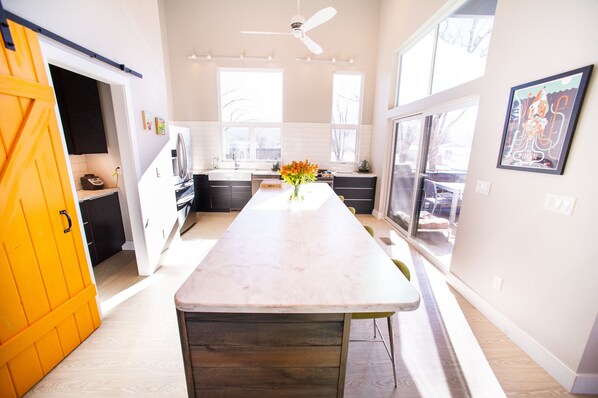 Cette maison de 2 chambres au deuxième étage offre une immense cuisine personnalisée entièrement équipée, un salon avec une télévision connectée de 65 pouces avec DirectTv NOW et un grand canapé moderne personnalisé du milieu du siècle. une luxueuse baignoire japonaise de 4 pieds de profondeur par 4 pieds de large qui peut accueillir 2 personnes avec une grande douche à effet pluie séparée dans Master Bath. Un endroit idéal pour se détendre après une longue journée sur les pistes ou les sentiers. Laveuse + sécheuse à la maison, barbecue au propane sur le pont du 2e étage, A / C disponible en été, Grand patio dans la cour latérale avec patio en dalles sur mesure. Entrée au 1er étage avec beaucoup d'espace pour les chaussures et les vêtements d'extérieur. La cour latérale peut être verrouillée pour ranger les vélos / skis / kayaks, etc. La maison est flambant neuve, veuillez donc prendre grand soin de l'espace. La chambre principale comprend également une SmartTv. Belle vue depuis chaque grande fenêtre de la maison avec beaucoup de lumière naturelle.