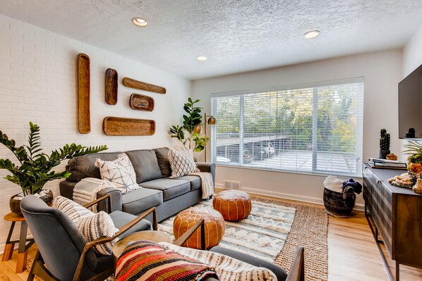 Entièrement rénovée et nouvellement aménagée en 2018, notre suite spacieuse présente des décorations décoratives design avec une cuisine immaculée remplie de tous les nouveaux appareils, épices et ustensiles pour préparer votre repas avec des sièges pouvant accueillir jusqu'à 4 personnes. Pour le divertissement, organisez le grand match sur le téléviseur haute définition 65 pouces câblé du salon. Ou dérivez pour dormir dans notre lit moelleux en regardant la télévision de 42 pouces dans la chambre. Nous incluons un parking couvert pour 1. Il y a un grand débarras pour ranger vos vélos ou skis. Les lits superposés portables pour enfants peuvent éventuellement étendre les couchages jusqu'à 6 personnes.