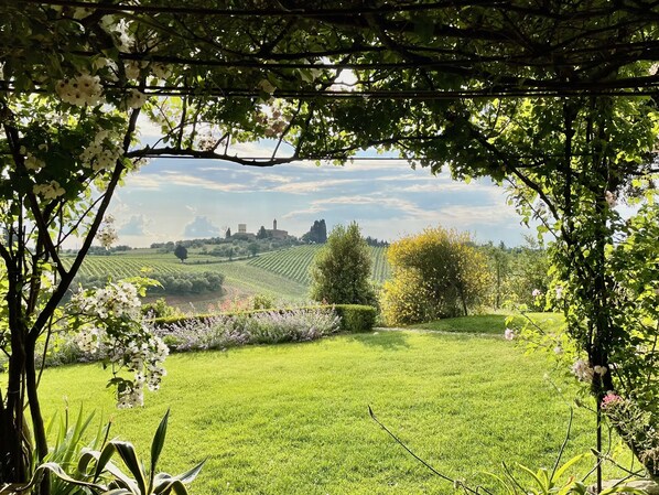 The property is located on the top of a hill with gorgeous sunrise and sunset views of the vineyards and olive trees. It is isolated from the main road but also within a short driving distance from small towns with stores and restaurants. The landscape is lush with roses, flowers, fruit trees and the back porch shaded under grape wines is perfect for breakfast and afternoon relaxation. The house is very comfortable, with decor keeping in tone with the "old world", has a large kitchen, fully equipped, nicely decorated bedrooms with comfortable beds and modern bathrooms, a sitting area with a cozy fireplace and a separate unit for more guests or family. Everybody in our party felt at home. We met Paola and Pietro upon our arrival and they were wonderful with suggestions, tips and arranging activities for us, so we have a great Tuscany experience. Highly recommended!