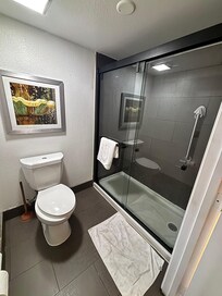 Salle de bain privée et refaite à neuf. Ménage pas fait durant mon séjour de 4 nuits. Pas de restauration à proximité.