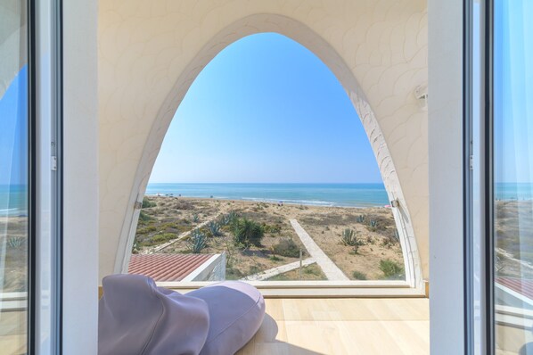 Une grande terrasse, avec une vue magnifique sur la mer, a des meubles de jardin et une table à manger et bénéficie d'un accès direct à la plage.
