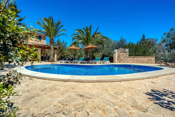 Le salon au rez-de-chaussée s'ouvre sur la grande terrasse couverte avec vue sur la piscine et le magnifique jardin paysager avec palmiers, quelques oliviers et vieux arbres. Le barbecue en brique est idéalement situé juste à côté de la terrasse. Autour de la piscine, il y a des terrasses ensoleillées avec suffisamment d'espace pour les chaises longues et une belle douche extérieure en pierre.