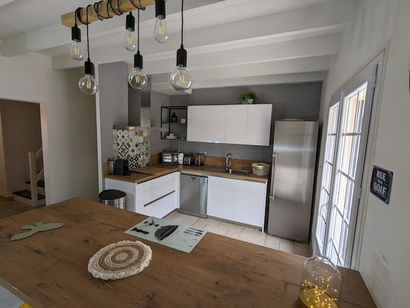 Profitez d'un deuxième espace extérieur avec table et fauteuils et barbecue. Au rez-de-chaussée, une entrée conduit à un vaste espace ouvert comprenant salon, salle à manger et cuisine avec îlot central. La cuisine offre un accès direct à la terrasse. Une grande chambre avec lit queen size et salle de bain attenante et accès à la terrasse, ainsi qu'un WC indépendant avec lavabo complètent ce niveau.