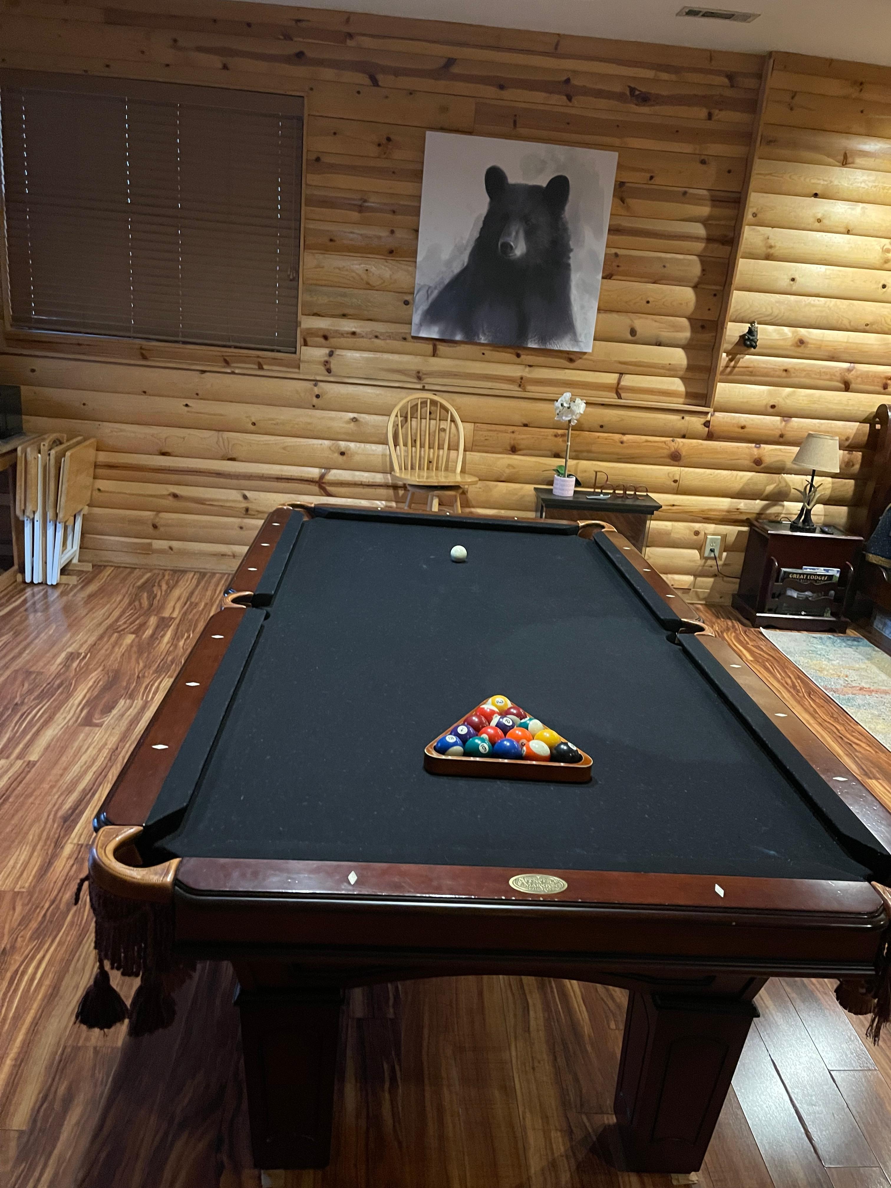 Entrez votre chambre de taille Queen avec une salle de bain complète. Cette chambre comprend une table de billard, une table de salle à manger, un mini-réfrigérateur et une cafetière. Vous avez un ventilateur de plafond et une télévision et chaîne stéréo au pied de votre lit. Il y a une porte coulissante en verre menant vers le pont avec un bain à remous, une table à manger en plein air pour deux personnes et un petit barbecue au charbon.