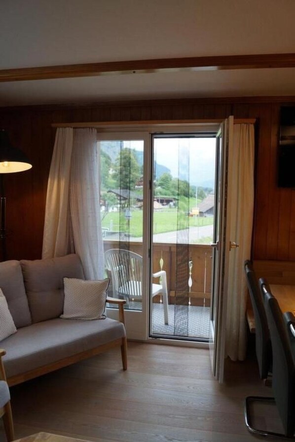 Der kleine Balkon mit Blick auf das Brienzer Rothorn ist mit einem Sonnenstoren, 4 Stühlen und einer kleinen Truhe ausgestattet und direkt durch das Wohn- und Esszimmer erreichbar. Der grössere Balkon ausgestattet mit Tisch, Stühlen und Sonnenschirmen ist durch den Gang im 1. Stock begehbar.