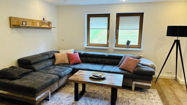 • gemütliches Wohnzimmer mit bequemer Couch, Smart-TV und Blick ins Grüne