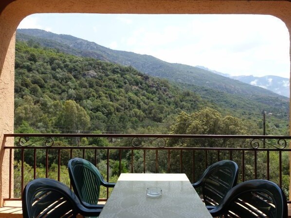"Residence Cabanaccia Studio 38m²", 1-Zimmer-Studio 38 m2. Wohn-/Schlafzimmer mit 1 x 2 Etagenbetten (90 cm, Länge 190 cm), 1 Doppelbett (140 cm, Länge 190 cm), Esstisch und TV (Flachbildschirm), Klimaanlage. Kochnische (2 Kochplatten, Toaster, Wasserkocher, Mikrowelle, elektrische Kaffeemaschine). Bad, sep. WC. Heizung. Terrasse überdacht. Terrassenmöbel. Sicht auf die Berge und die Landschaft. Parkplatz beim Haus. Bitte beachten: Nichtraucher-Unterkunft. Rauchmelder. Inserat eines gewerblichen Vermieters nach Artikel 155, IV, CGI