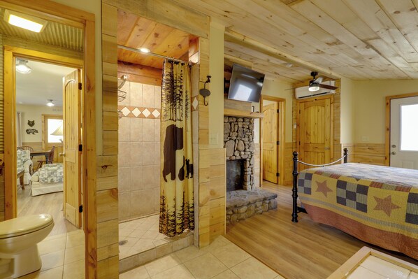 L'espace de vie principal présente une décoration rustique, un mobilier confortable, une cheminée à gaz en pierre et une télévision par câble à écran plat. Détendez-vous et suivez l'actualité récente pendant que le chef prépare le dîner dans la cuisine. Des appareils modernes et un comptoir enveloppant avec des sièges de bar facilitent la préparation de recettes gastronomiques dans la cuisine entièrement équipée.