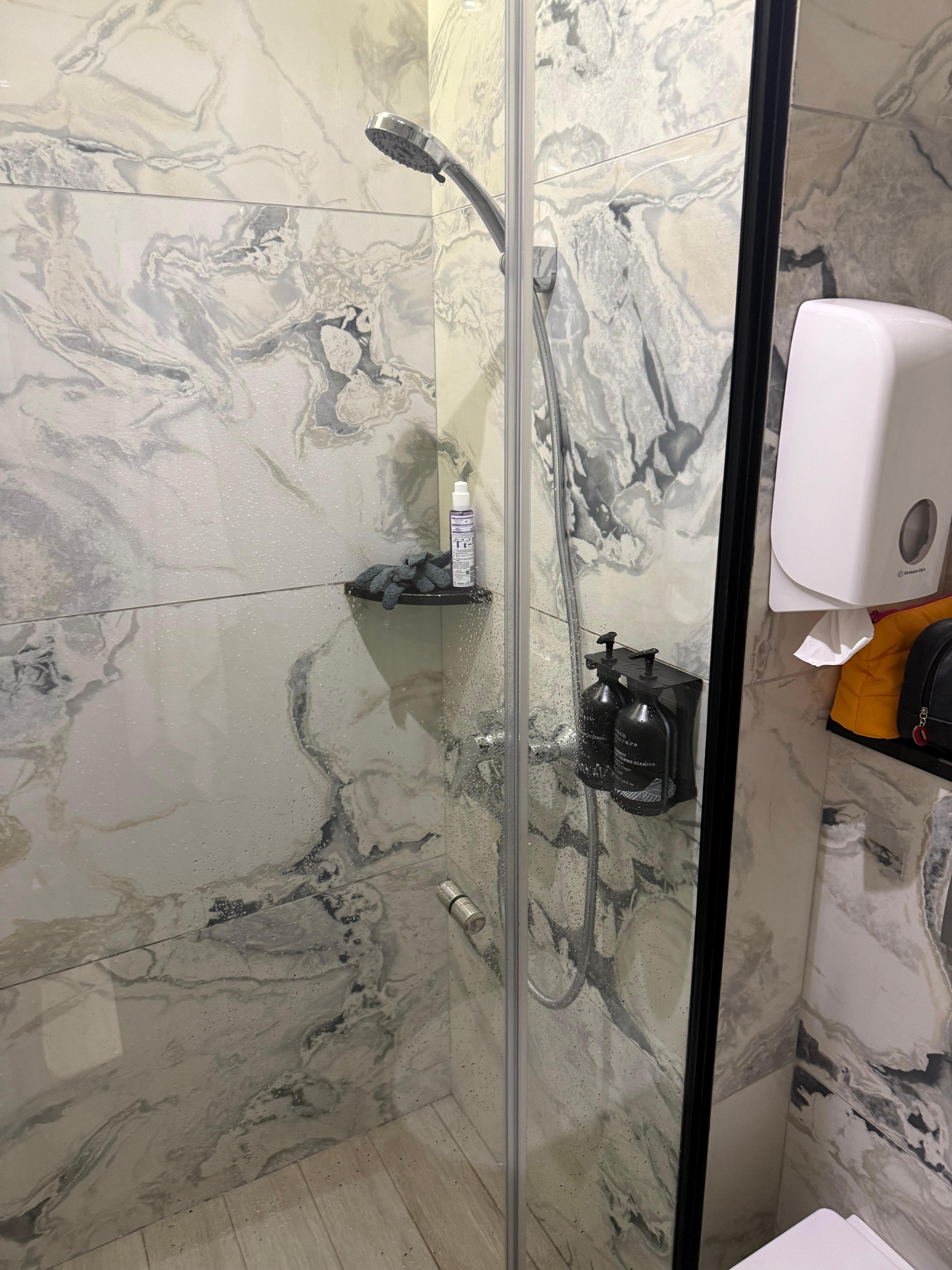 Salle de bains avec douche et articles de toilette gratuits