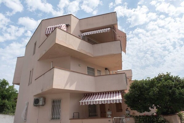 Description: second floor. Pleasant and welcoming furnishings. Large living room with sofa, dining table and kitchenette – double bedroom – bedroom with single bed – bathroom with shower and washing machine – large terrace equipped with table, chairs and awning. Parking space. Air conditioning.