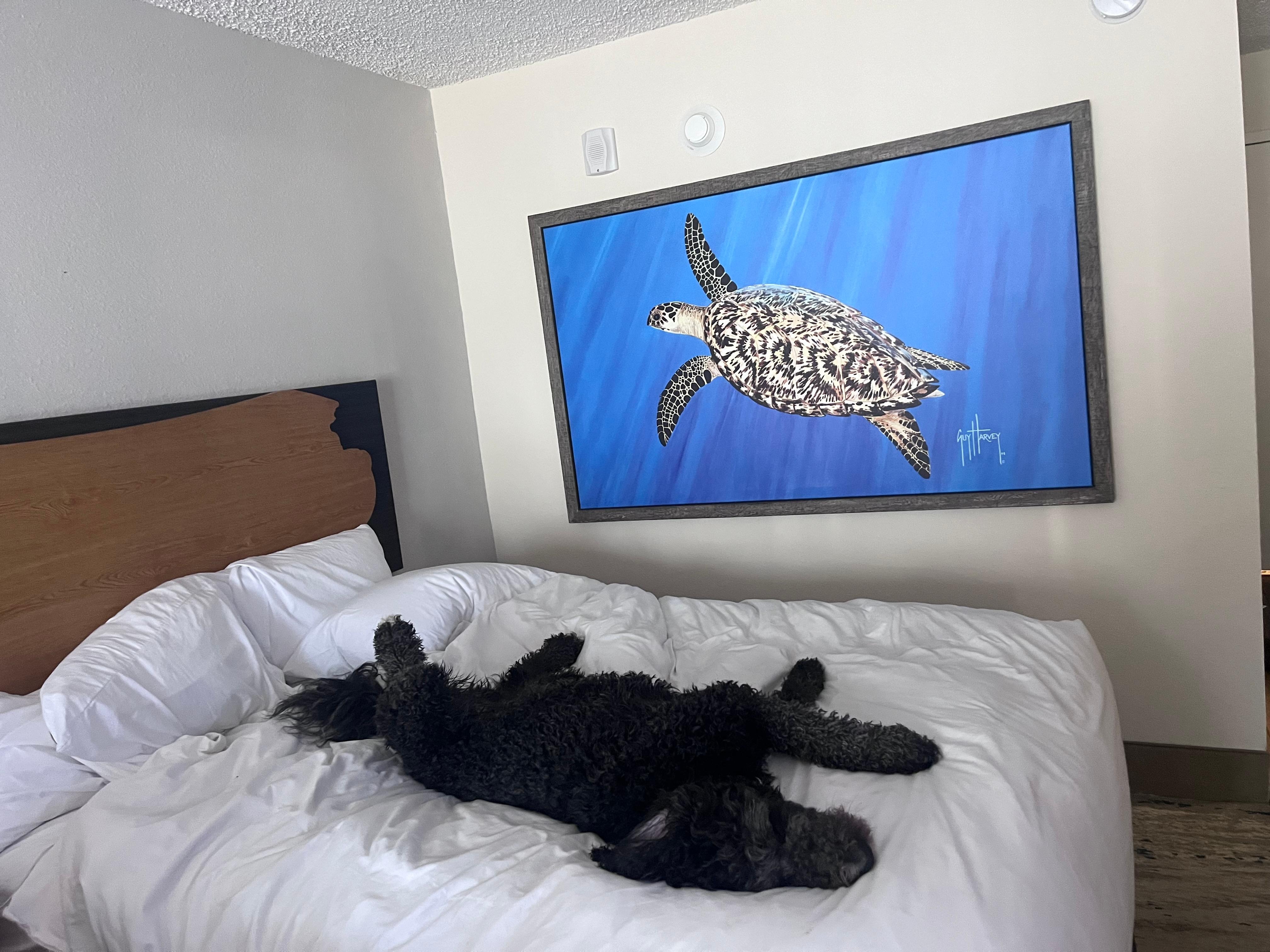 The hotel is the beach, everything is clean. The beach is clean and beautiful. Hotel is very dog friendly and had great areas where dogs could potty which is awesome. The room was spotless. Excellent customer service. The pool was clean and was cool colors at night. Little awesome, well kept gym. Not a single complaint.