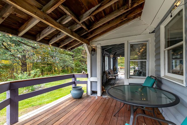 The property was great too. There are several distinct areas of yards, one is a beautiful meadow uphill from the home. Our small dogs loved playing up there and cruising the other yard segments. Some days we picked and ate berries from several patches on the property. It was also fun having morning coffee on the deck and watching the wild turkey chicks be escorted around by their parents. We’re not city folk, but this property has so much that you otherwise would need to drive to experience. The host lives in a different building on the property and we didn’t see her around much (works a lot elsewhere I gathered). It was very comfortable with her there … very respectful of our privacy and happy to help if we needed. An added bonus … almost no cars passing on Birch Hill Rd and no noise or light pollution!