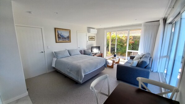 Une connexion Wi-Fi haut débit illimitée est disponible, ainsi que de nombreuses chaînes pour vous divertir sur votre télévision avec chaînes gratuites tandis que vous vous détendez dans le confortable studio doté d'un canapé-lit, d'une table basse et d'une salle à manger.