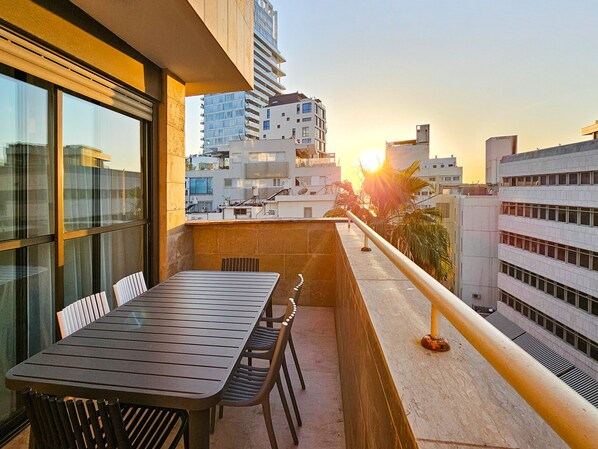 Le balcon est aménagé pour tous vos repas en famille ou entre amis (table, chaises).